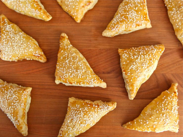 These use puff pastry wrappers, as did Rx's. I did not use sesame seeds nor an egg yolk wash on top, but they are still quite lovely. And of course delicious.